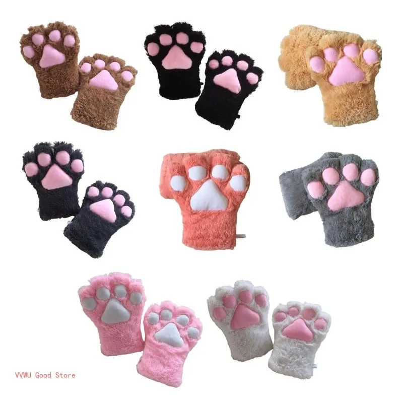 Cute Womens Plush Cat Paw Gloves Warm Fluffy Kitten Mittens For Cosplay Halloween Costume